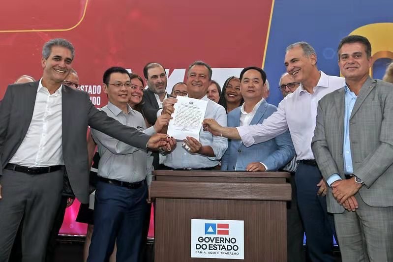在巴伊亚州长鲁伊科斯塔(演讲桌左)和中国驻巴西大使杨万明(演讲桌右)的见证之下,比亚迪被授予萨尔瓦多云轨一期工程的开工许可证