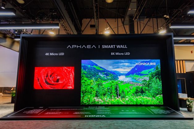 从新概念角度来看,康佳惊艳展出了应用Micro LED技术的Smart Wall系列产品。据悉,该产品能实现近1亿颗微米级别的Micro LED芯片的转移和键合,以获得更具优势的画质表现。