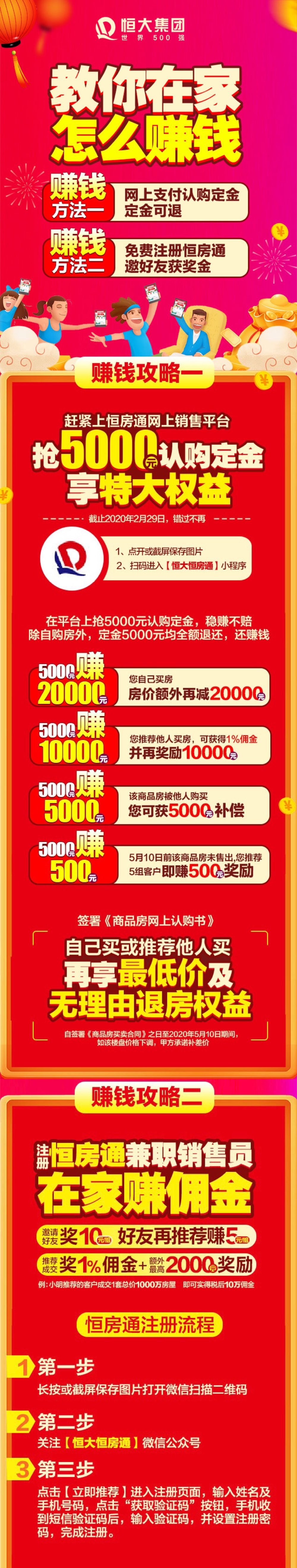 2月13日,恒大率先实施全国所有楼盘网上购房的营销创举,并给消费者提供最低价购买、无理由退房、多重购房优惠等福利举措,推荐认购或者推荐注册“恒房通”还能赚取佣金和奖励。在一系列重磅优惠政策的推动下,必然掀起网上购房潮流。
