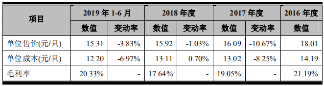 据招股书显示,报告期内,其电源适配器产品单位售价(元/只)分别为18.01、16.09、15.92及15.31;同期单位成本(元/只)分别为14.19、13.02、13.11及12.20。