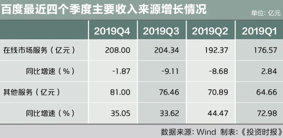 可以看到,2019年除第一季度外,百度网络营销收入同比增速均为下滑趋势。百度方面表示,一季度的增长主要由于教育、零售和商业服务表现强劲,而医疗保健、在线游戏服务和金融服务板块则表现欠佳。