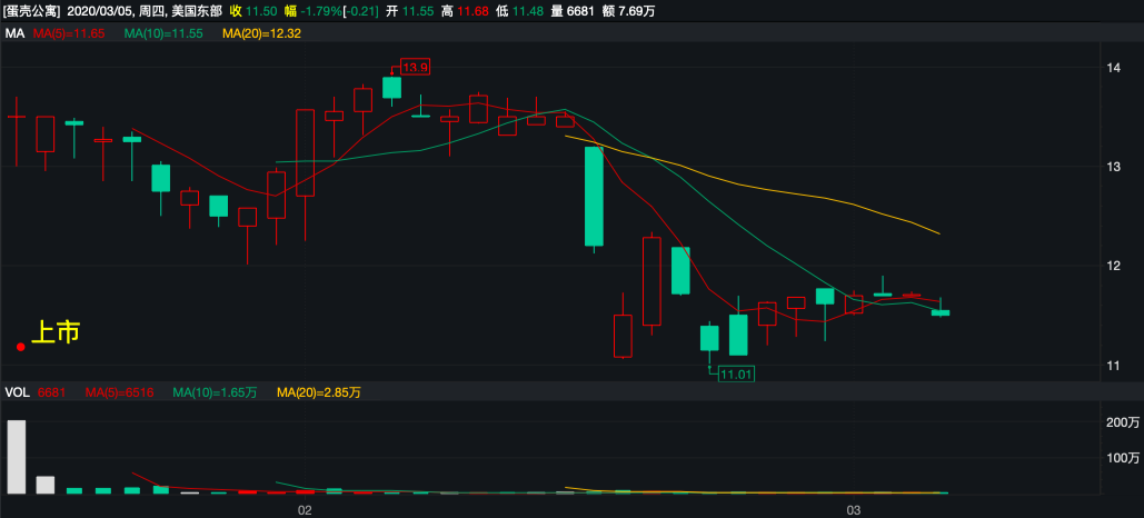 今年1月17日刚刚于美股上市的该公司,上市当日股价亦跌破发行价。截至美东时间3月5日收盘,蛋壳公寓收于11.5美元/ADS,较上市首日13.5美元/ADS收盘价,下跌14.8%。