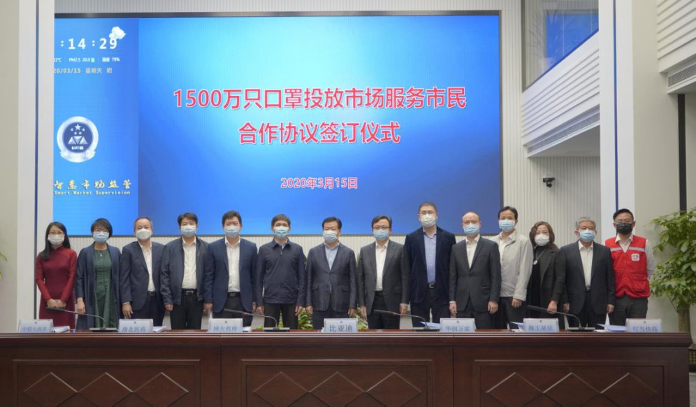 3月15日上午,“1500万只口罩投放市场服务市民合作协议”签约仪式在深圳市市场监督管理局举办。比亚迪与华润万家、国大药房、海王星辰、南北医药、叮当快药、中联大药房等企业协商一致,携手在深圳市场持续投放平价口罩1500万只,以更好满足深圳市民的口罩需求。