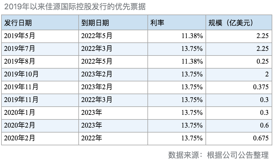 据2019年业绩公告披露,2019年佳源国际控股共发行了6笔优先票据,规模合计7.425亿美元:两笔合计2.5亿美元的优先票据利率为11.375%,4笔合计4.925亿美元的优先票据利率为13.75%。