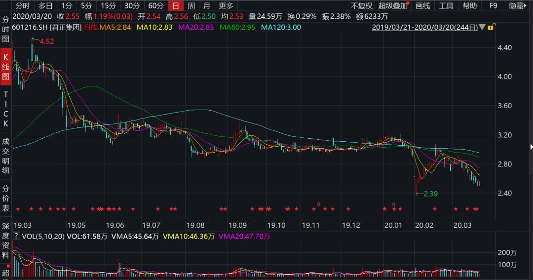 Wind数据显示,3月20日,君正集团股价微涨1.19%,收报于2.55元,与2月4日创下的2.39元股价历史最低点,相距不远。