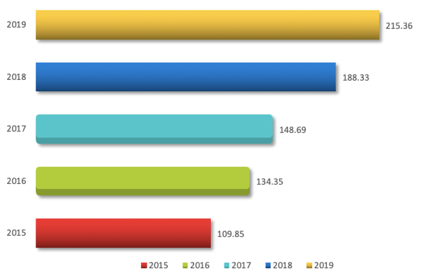 其中,销售及经销费用为近五年来新高,首次突破200亿元,达215.36亿元,同比增长14.35%,与营收增速十分接近。这或意味着,增加的营销费用并没有高效拉动该公司的营收增长。