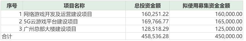 该预案显示,三七互娱拟通过非公开发行股票募集不超过人民币45亿元资金,其中16亿元用于“网络游戏开发及运营建设项目”,16.5亿元用于“5G云游戏平台建设项目”,12.5亿元投入“广州总部大楼建设项目”。