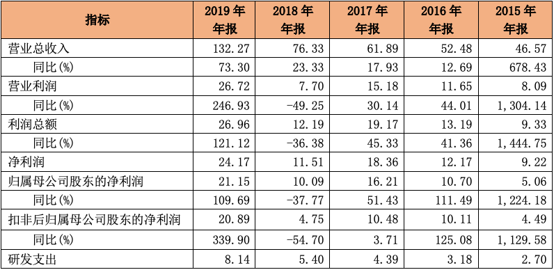 据其年报披露,2019年该公司实现营业收入132.27亿元,同比增长73.30%,首次突破百亿元;利润总额26.96亿元,同比增长121.12%;归属于上市公司股东的净利润为21.15亿元,较上年同期增长109.69%;加权平均净资产收益率达32.66%,较2018年提高16.07个百分点,公司盈利能力显著提升。