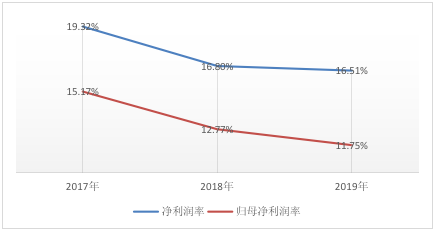 但是,在规模快速扩张的同时,这家房地产公司的利润率却持续下滑:2017—2019年度净利润率依次为19.32%、16.80%、16.51%,期间归母净利润率由15.17%渐降至11.75%。