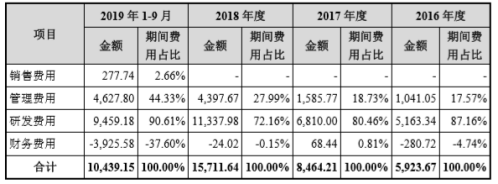 可以看出,报告期内该公司研发费用持续增长,其中2017年及2018年其研发费用分别同比增加1646.66万元、4527.98万元,同比增长31.89%、66.49%,2019年1—9月研发费用金额亦接近2018年全年水平。