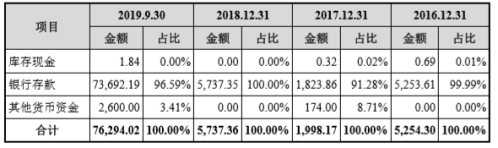 另外,招股书数据显示,报告期各期末,该公司货币资金余额分别为5254.30 万元、1998.17万元、5737.36万元及7.63亿元,占流动资产的比例分别为35.79%、4.68%、26.01%及88.75%,主要为银行存款。
