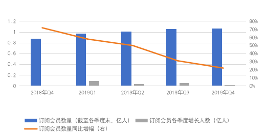 目前,会员服务收入已成为爱奇艺相当重要的收入来源,在2019年广告收入同比下滑的对比下,会员服务收入的重要程度更加凸显。不过从订阅会员(近98%为付费会员)数量来看,爱奇艺截至2019年末的订阅会员数量同比增幅走低,从2018年末的72%降至2019年末的22%,下降了50个百分点。而从各季度订阅会员增长情况来看,2019年全年,爱奇艺共增长1950万订阅会员用户,其中第四季度仅增长110万人,占比6%。