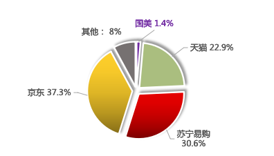 而从国美方面考量,国美零售线上市场渠道拓展乏力。据全国家用电器工业信息中心编制的《2019年中国家电行业年度报告》显示,2019年,中国家电行业线上市场零售额规模为3108亿元,同比增长4.2%,市场份额达到38.7%。而国美零售线上份额占比仅为1.4%,远远落后于京东、苏宁易购集团股份有限公司(下称苏宁易购,002024.SZ)及浙江天猫技术有限公司(下称天猫)。