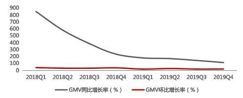 不过,《投资时报》研究员查阅该公司近两年季度业绩数据发现,其GMV同比增速已由2018年第一季度的850.72%逐渐收窄至2019年第四季度的113.44%,环比增速同期也大幅下降21个百分点。