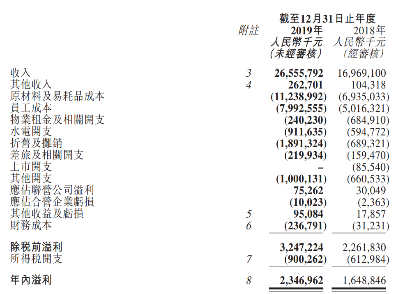 据海底捞2019年年度报告显示,全年实现营业收入265.56亿元,同比增长56.24%;实现归母净利润23.45亿元,同比增长42.44%。门店数量也从2018年末的466家增长到2019年末的768家,其中新开业308家,因租约到期和其他商业原因关店6家,净开业302家。