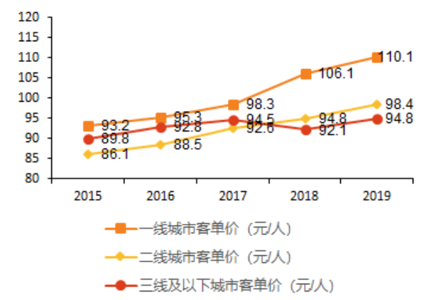 值得注意的是,据天风证券研究所数据显示,三线城市和一二线城市的翻台率分别在2017年和2018年达到5.2次/天、5.1次/天和5.3次/天的高点后,开始呈现下滑态势,某种程度上显示了对顾客的吸引力下降。