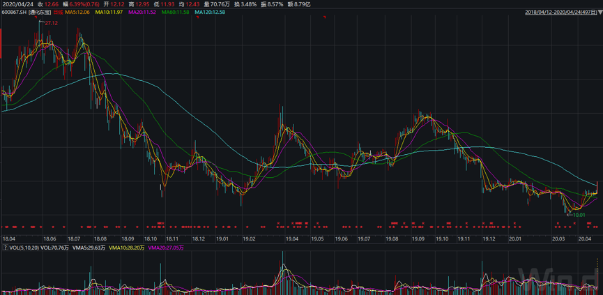 2020年4月27日,通化东宝报收于12.92元/股,较52周高点已下挫33.22%。