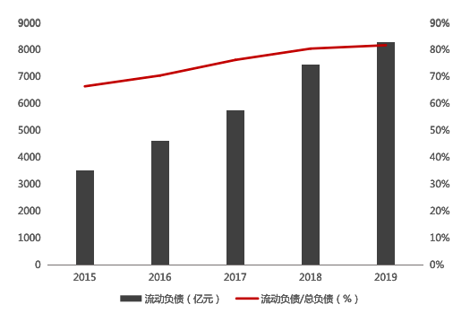 需要注意的是,该公司财务杠杆较高,数据显示,其2019年资产负债率为88.53%,且流动负债在总负债中的占比高达81.81%。