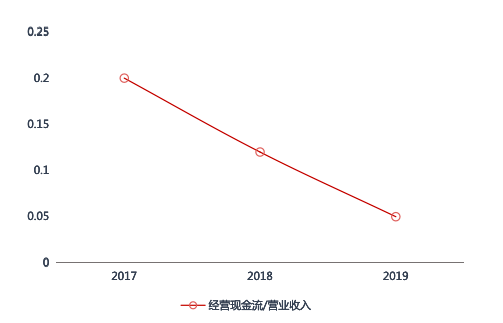 此外,2017年—2019年,该公司经营现金流占营业收入的比例分别为0.2、0.12及0.05,呈现收窄趋势,该指标作为衡量公司盈利质量的重要指标,也在一定程度上反映出公司盈利质量有所下降。