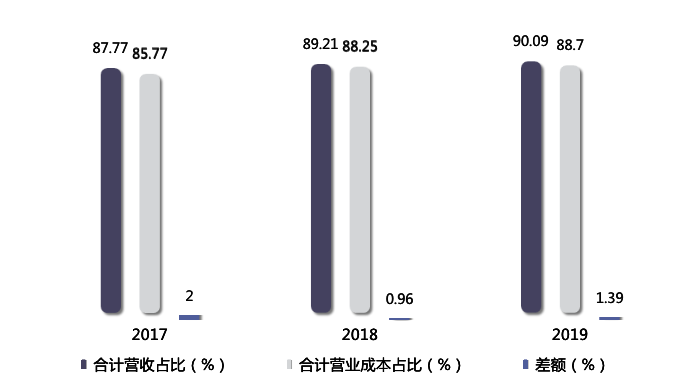 年报显示,2019年该公司三大主营业务营收为2542.86亿元,同比增长6.81%;营业成本为1765.94亿元,同比增长4.71%;毛利率为30.55%,同比增长1.39个百分点。
