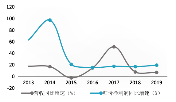 具体来看,2013年—2019年,该公司营收同比增速分别为17.91%、17.11%、-2.28%、14.88%、51.35%、7.87%及7.14%,归母净利润同比增速分别为63.15%、97.5%、20.99%、15.56%、17.7%、17.05%及19.68%。