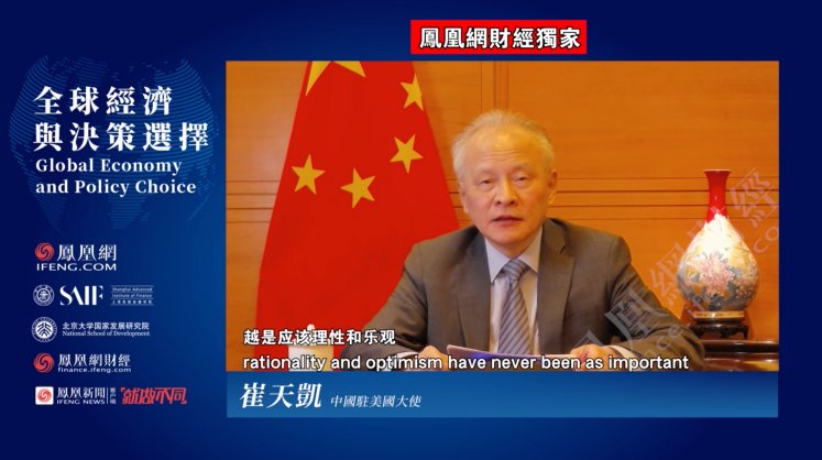在5月7日凤凰网财经云峰会开幕式上,中国驻美国大使崔天凯发表了题为《携手冲破至暗时刻,合作塑造后疫情时代》的重磅演讲。十五分钟的发言铿锵有力,振奋人心,涌现了不少“金句”:“萨德防不了SARS,核武器打不退新冠”;“如果政策被冷战思维绑架,各国无一例外都是输家”;“人不能两次踏进同一条河流,却能因为遗忘历史而再次掉入同样的深坑”。