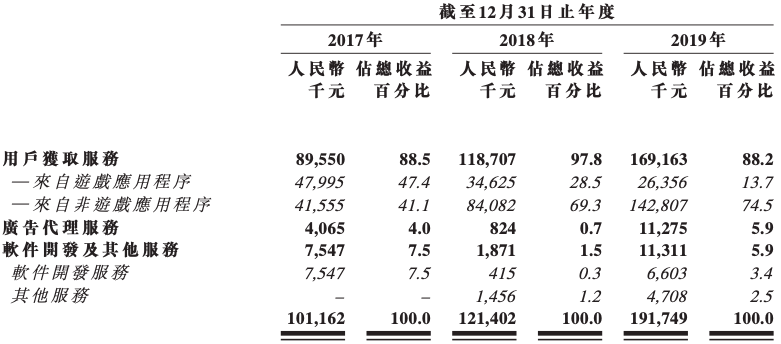 《投资时报》研究员注意到,爱酷游主要收入来源于用户获取服务,报告期内该项业务收入占比分别为88.5%、97.8%及88.2%。其中,非游戏应用程序收入占比分别为41.1%、69.3%及74.5%。
