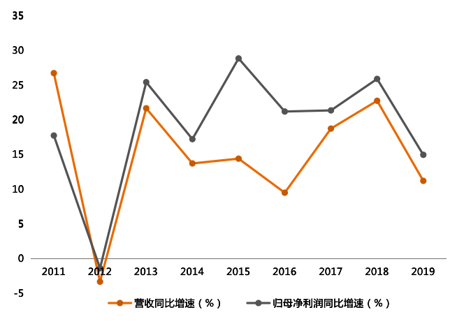 具体来看,2011年—2019年,该公司营收同比增速由2011年末的26.74%降至2019年末的11.22%,同期,归母净利润同比增速由17.75%降至14.97%。相对于归母净利润同比增速,其营收增速波动更大。