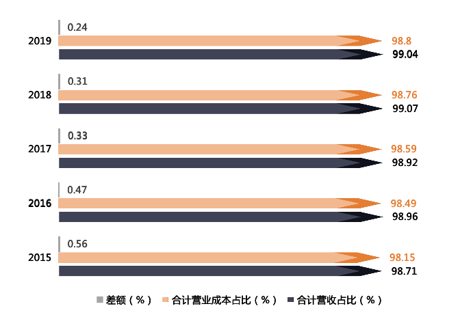 需要注意的是,上述两大业务合计营收占比与合计营业成本占比之差逐年缩小,由2015年末的0.56%下降至2019年末的0.24%,侧面反映出两大主营业务的营业成本占比增速快于营收占比增速,在一定程度上拉低了产品的营收空间。