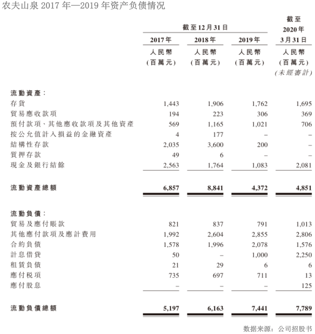 《投资时报》研究员发现,近100亿元的股利分配对农夫山泉的多项财务数据都产生了冲击,该公司2019年的现金及银行结余、结构性存款分别大幅降至10.83亿元和2.00亿元,流动资产总额从2018年末的88.41亿元降至43.72亿元,流动负债总额则从2018年末的61.63亿元增至74.41亿元。