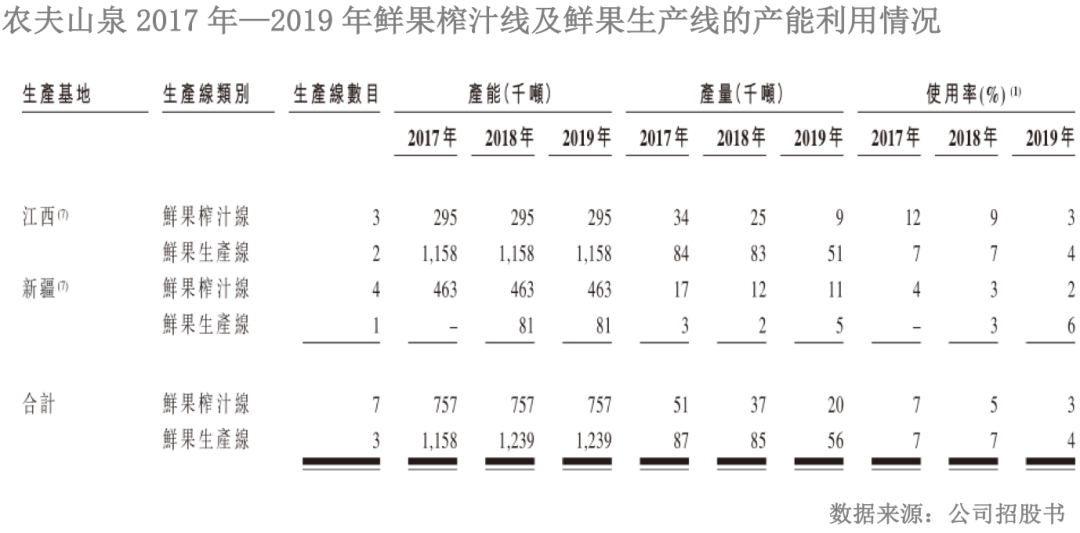 不过该公司各生产基地的产能利用率并不高,2017年—2019年(下称报告期各期)包装饮用水产品生产线的合计使用率分别为46%、49%和51%,饮料产品生产线的合计使用率分别为54%、52%和52%,鲜果榨汁线的合计使用率分别仅为7%、5%和3%,鲜果生产线的合计使用率分别仅为7%、7%和4%。