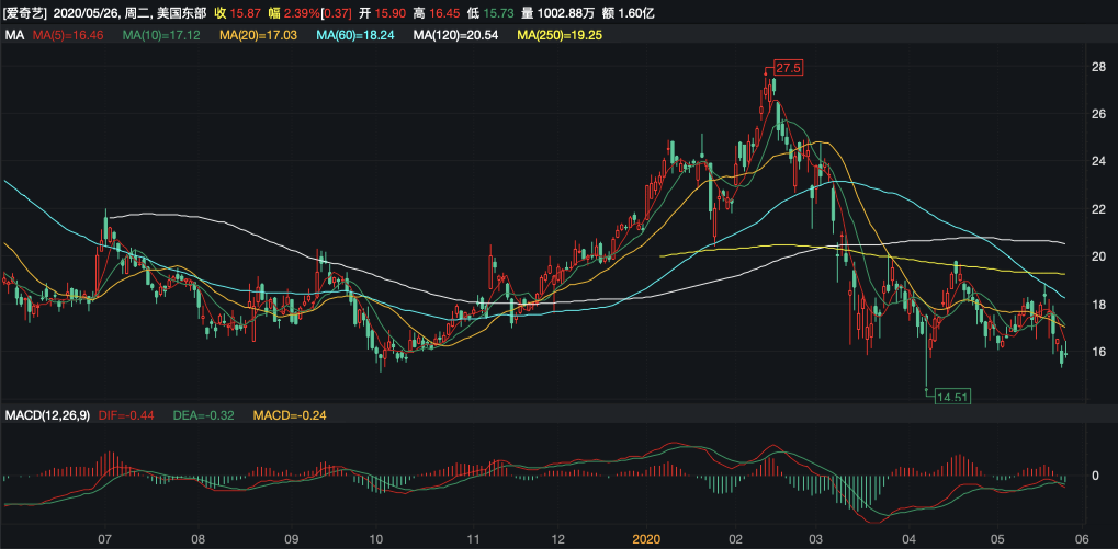 截至美东时间2020年5月26日收盘,爱奇艺收于15.87美元/ADS,较今年2月中旬创下的27.5美元/ADS阶段性高点下跌42.3%。