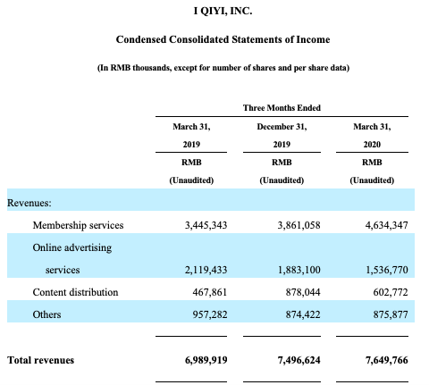 《投资时报》研究员注意到,作为爱奇艺营收来源的重要组成部分,会员服务收入已连续7个季度超过广告收入,成爱奇艺为第一大收入来源。在2020年一季度广告和其他业务分别同比下滑27%、9%的情况下,如果会员业务没有新的增长点,还未盈利的爱奇艺整体增长将不容乐观。