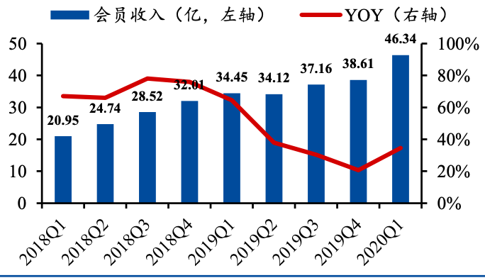 爱奇艺2018Q1—2020Q1会员收入及同比变化