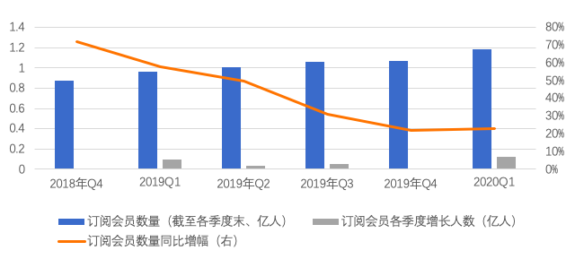 目前,会员服务收入已成为爱奇艺相当重要的收入来源,在2019年广告收入同比下滑的对比下,会员服务收入的重要程度更加凸显。不过从订阅会员数量来看,爱奇艺截至2019年末的订阅会员数量同比增幅走低,从2018年末的72%降至2019年末的22%,下降了50个百分点。而截至2020年一季度末1.19亿订阅会员数(其中99.2%为付费会员),较2019年一季度末的会员数量增幅也仅为23%,与截至2019年末的增速几乎持平。
