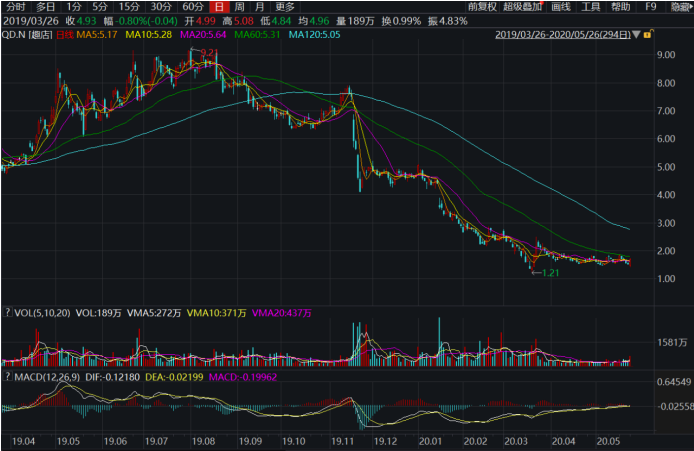 5月22日,趣店股价收于1.5美元,较2017年10月18日发行价24美元跌去93.75%,较趣店创始人、董事长兼CEO罗敏千亿美元市值的目标也越行越远。