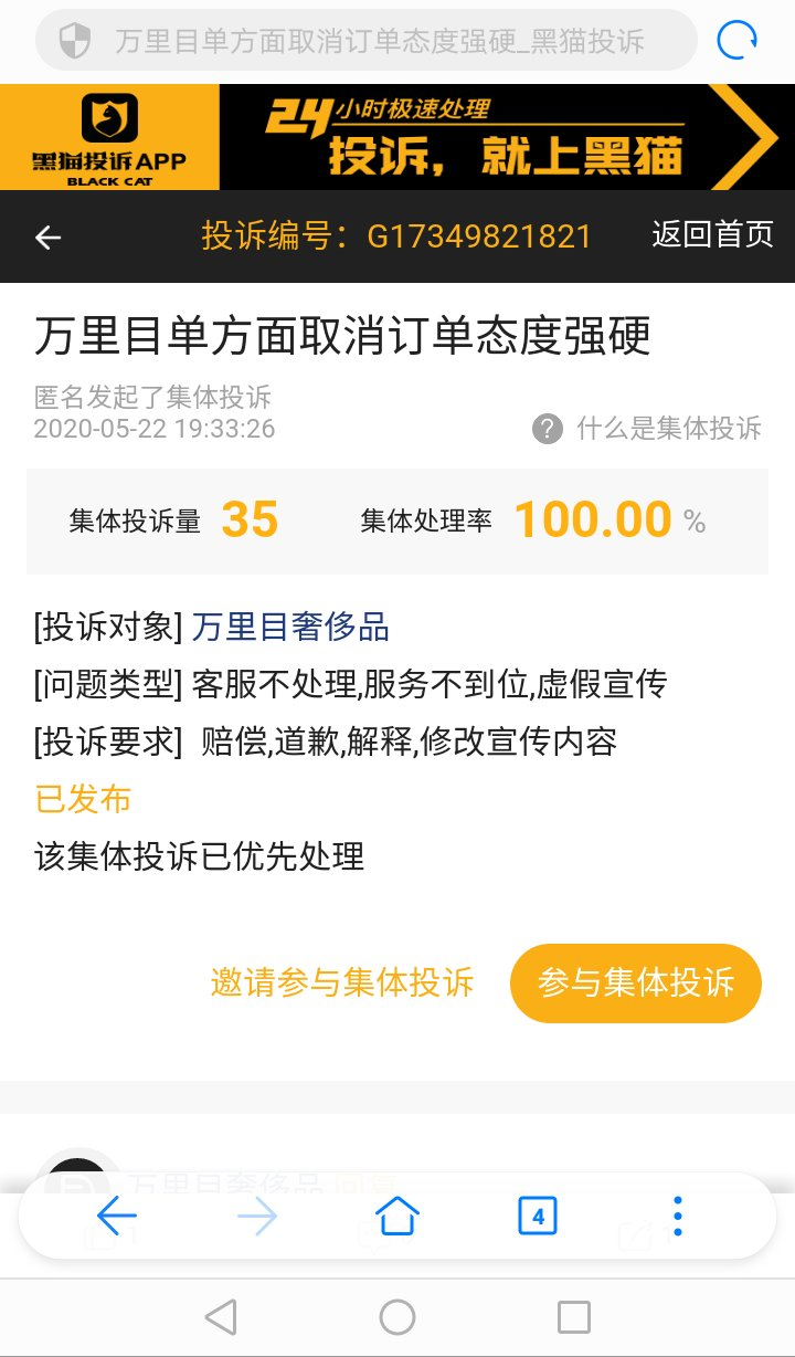 根据黑猫投诉上的信息,截至今年5月25日,用户对万里目的投诉已达316件。投诉内容主要包括:单方面取消订单、长时间不发货不退款、涉嫌“虚假宣传”、涉嫌售“假货”等。