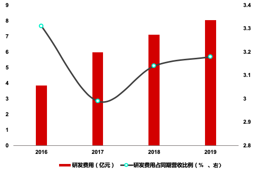 《投资时报》研究员留意到,2016年—2019年,该公司研发费用分别为3.85亿元、5.98亿元、7.12亿元及8.05亿元,占各期营收的比重分别为3.31%、2.99%、3.14%及3.18%,可以看到,该公司近几年研发投入的绝对值呈现上升态势,但近三年累计研发投入占同期累计营收的比例一直维持在3%上下。