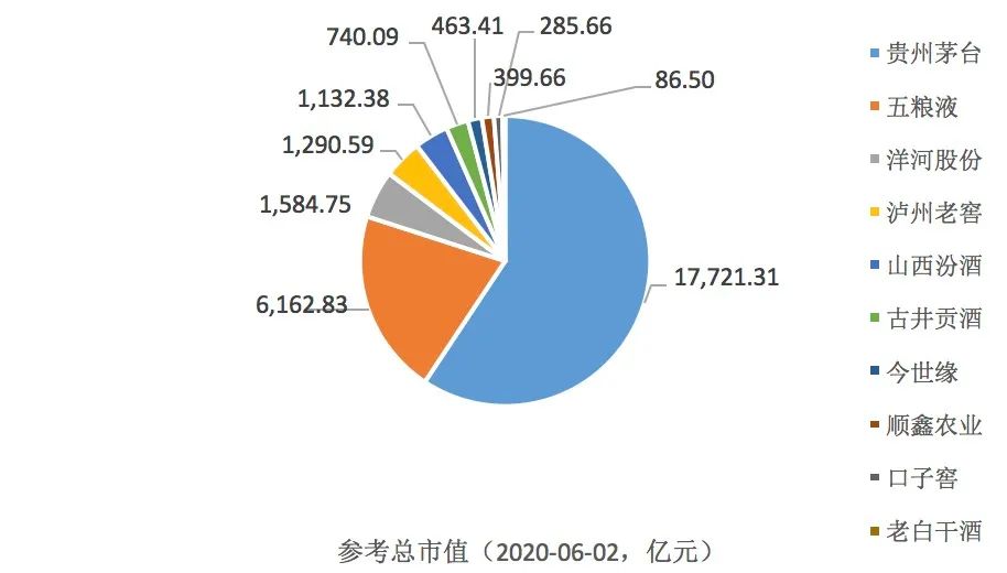 而从二级市场来看,截至2020年6月2日收盘,市值过千亿的白酒上市公司共有五家,分别为贵州茅台、五粮液、洋河股份、泸州老窖和山西汾酒,其市值分别为17721.31亿元、6162.83亿元、1584.75亿元、1290.59亿元和1132.38亿元。