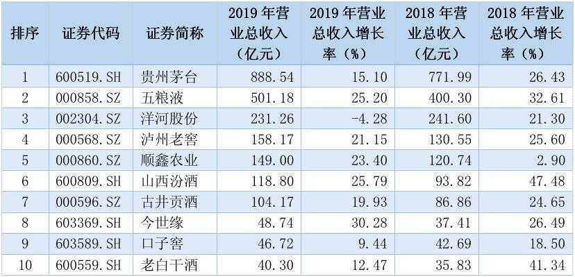 《投资时报》研究员查阅2019年白酒行业营收排名前十的上市公司注意到,贵州茅台(600519.SH)、五粮液(000858.SZ)、洋河股份(002304.SZ)、泸州老窖(000568.SZ)、顺鑫农业(000860.SZ)、山西汾酒(600809.SH)、古井贡酒(000596.SZ)、今世缘(603369.SH)、口子窖(603589.SH)、老白干酒(600559.SH)这十家上市公司整体保持稳定增长,但大部分公司增速较2018年略有下滑。