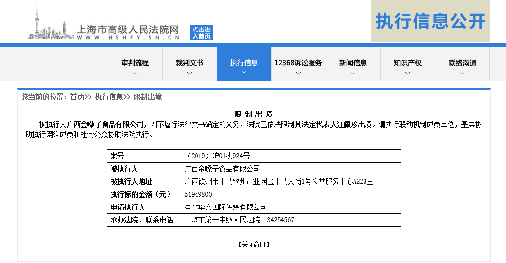 日前,上海市高级人民法院网发布公告称,因广西金嗓子食品有限公司(下称金嗓子食品)不履行法律文书确定的义务,其法定代表人江佩珍已被依法限制出境。