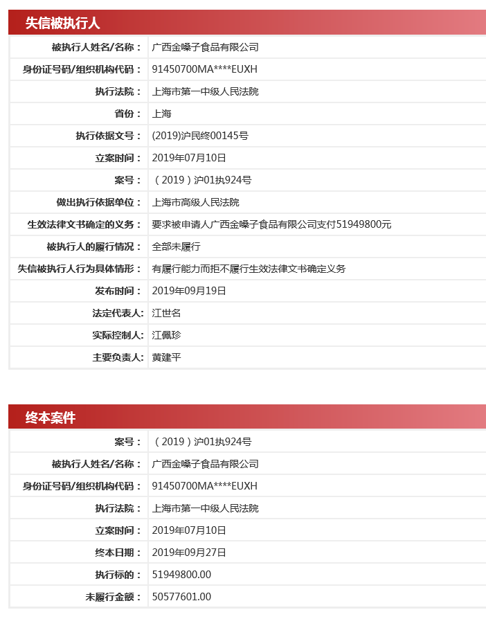 虽然有法院的判决结果,但金嗓子食品并未执行相关判决。2019年9月19日,金嗓子食品被上海市第一中级人民法院列为失信被执行人,公司实控人江佩珍也被列为限制消费人员,被限制乘坐飞机、在星级以上宾馆居住等高消费行为,成为“老赖”。