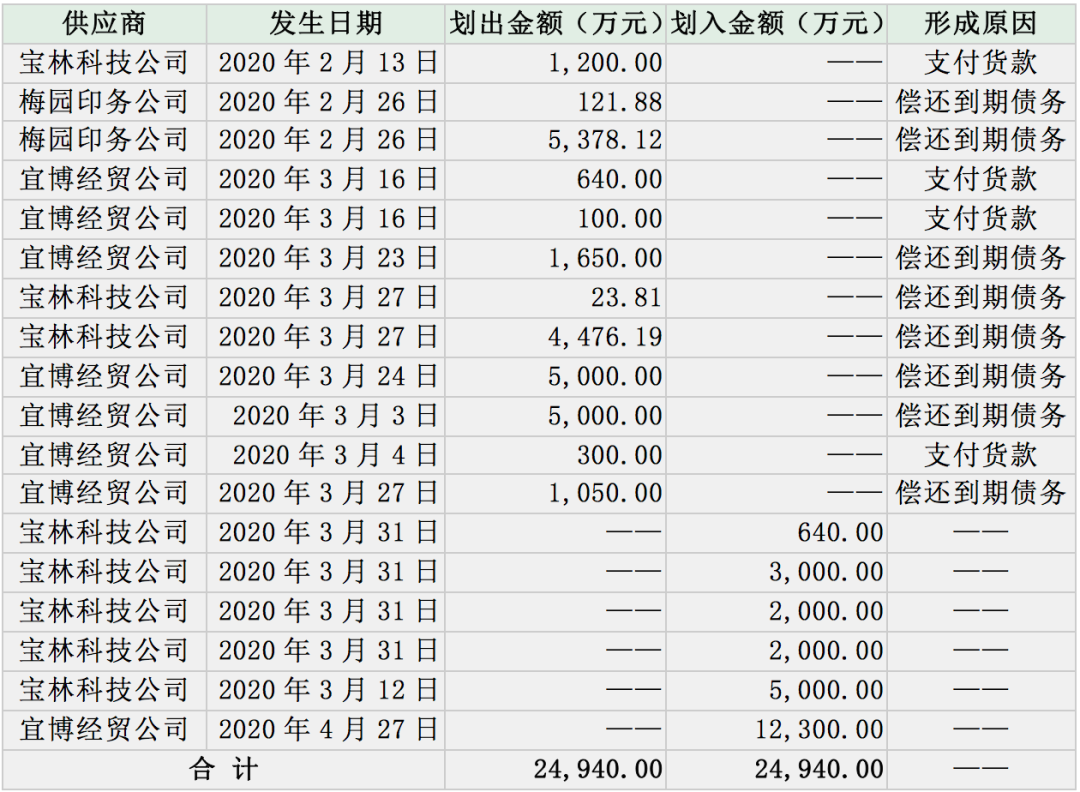 《投资时报》研究员查阅贵州百灵两周前披露的《关于深圳证券交易所关注函回复的公告》注意到,2019年,贵州百灵以预付货款、银行贷款定向支付的方式向供应商贵州宜博经贸有限责任公司(下称宜博经贸)、潮州市潮安区梅园印务有限公司(下称梅园印务)、安顺市宝林科技中药饮片有限公司(下称宝林科技)累计划出资金20.85亿元。其中,通过上述供应商进行的银行倒贷资金为14.23亿元、供应商使用资金为1.704亿元、实际控制人占用资金为4.92亿元,累计收回资金21.44亿元(含利息)。