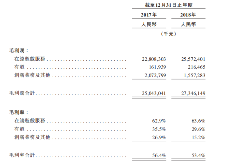 从毛利率分析,网易毛利率由2017年的56.4%下滑至53.4%。其中,除在线游戏服务毛利率有所提升外,有道毛利率由35.5%下滑至29.6%,创新业务及其他毛利率由26.9%下滑至15.2%。