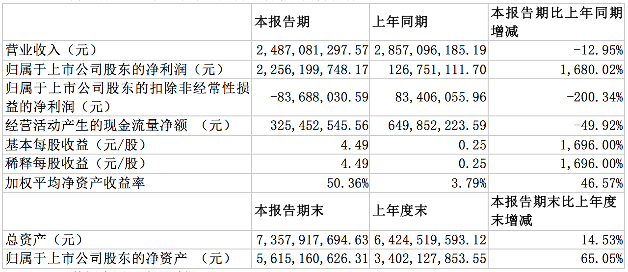 半年报显示,报告期内,好想你实现营业收入24.87亿元,同比减少12.95%,实现归属于上市公司股东的净利润为22.56亿元,同比大增1680.02%。