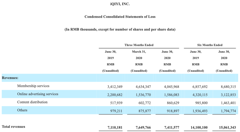 事实上,爱奇艺是在发布2020年二季度未经审计财务报告的同期发布的前述公告。财报显示,2020年第二季度爱奇艺总营收达到74亿元人民币(下同,约合10亿美元),同比增长4%,总营收和同比增速符合该公司此前的预期。作为爱奇艺最主要收入支柱的会员营收在第二季度达到40亿元,同比增长19%。广告收入、内容发行收入和其他营收分别实现16亿元、8.6亿元和9.18亿元。
