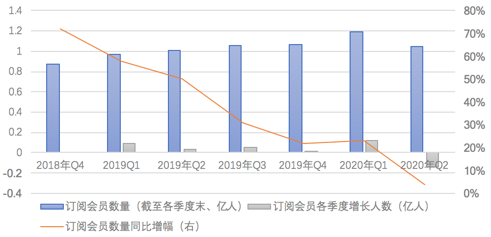 截至2020年二季度末,爱奇艺订阅会员数量达1.049亿人,同比仅增长4%。且从环比数据来看,爱奇艺二季度会员数量减少0.141亿人。甚至低于2019年第三季度末的1.058亿人和四季度末的1.069亿人。