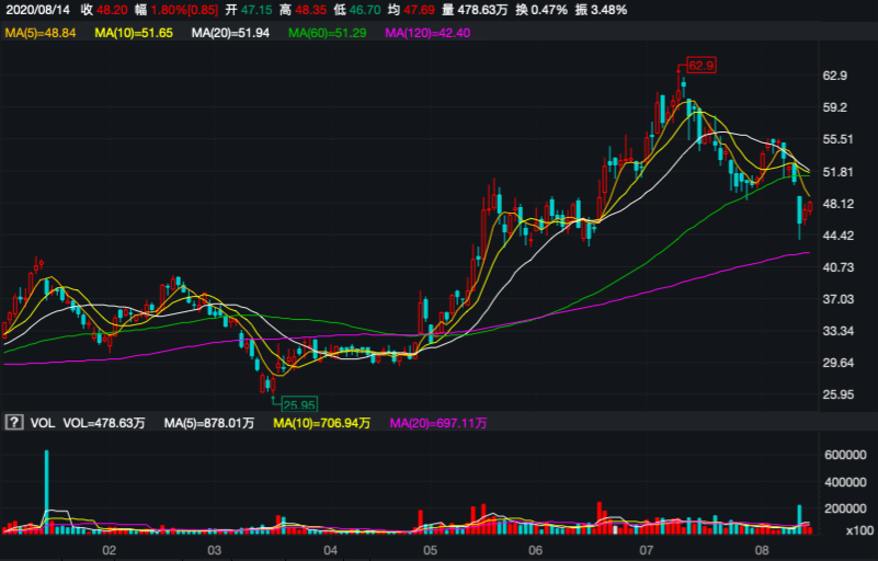 截至2020年8月17日收盘,阅文集团收于48.05港元/股,较今年7月创下的62.9港元/股年内高点,下挫23%,最新总市值为490亿港元。