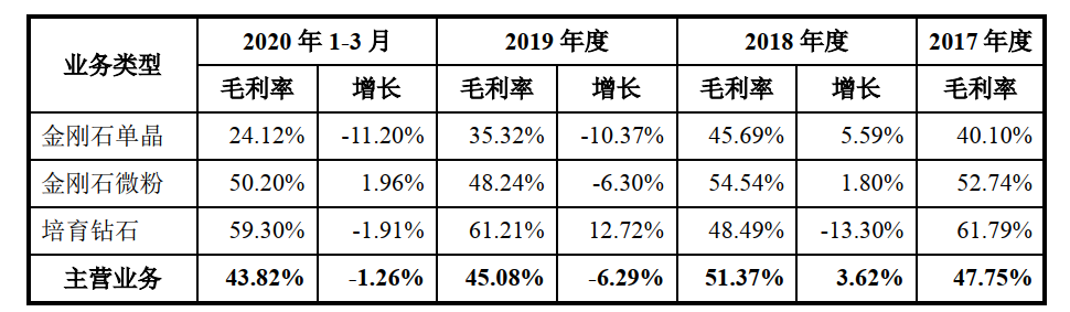 从各大产品分别来看,金刚石单晶毛利率下滑趋势较为显著,报告期内分别为40.10%、45.69%、35.32%和24.12%,尤其是自2018年后下降非常明显。而该部分收入占2019年主营业务收入的比重超4成,显示出其对整体毛利率下滑影响较大。