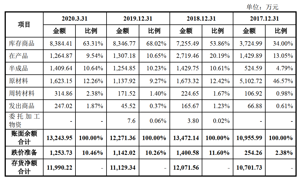 据招股书披露,报告期内,该公司存货账面价值分别为1.07亿元、1.21亿元、1.11亿元和1.20亿元,占总资产的比例分别为31.73%、28.12%、19.58%和20.74%。